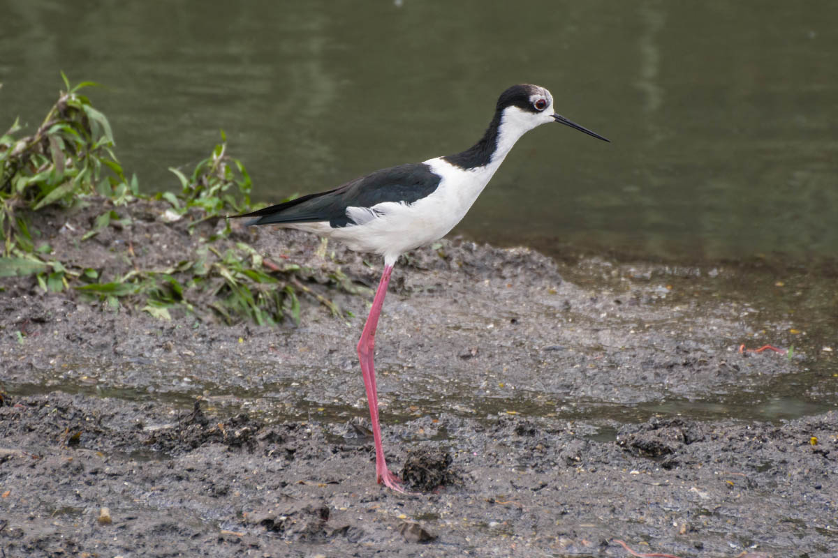 Mede 38cm de comprimento. Os adultos têm longas pernas rosa, um bico comprido e preto e uma extensa faixa branca que se estende na parte inferior do abdome, pescoço e parte da cabeça, que tem sua parte superior preta, assim como a nuca e costas. As pernas medem, sozinhas, cerca de 16 cm e, quando ave voa estas ficam dispostas longitudinalmente em relação ao corpo. Possui hábitos e comportamentos semelhantes aos do pernilongo-de-costas-brancas (Himantopus melanurus), dos quais difere pelas costas negras.
