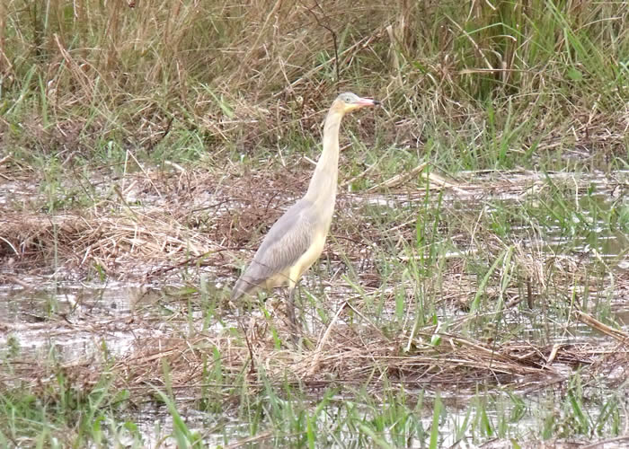 Enquanto a maioria das garças voa com o pescoço dobrado em “S” a maria-faceira costuma voar com o pescoço esticado.