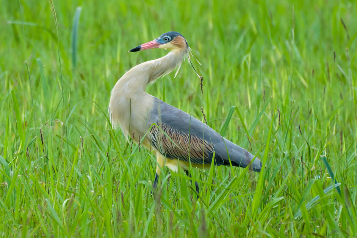 Simplesmente inconfundível. É a única garça brasileira com este padrão de coloração. O nome comum está ligado às cores espetaculares da cabeça: face azul-clara, coroa e crista acinzentadas e bico róseo com mancha azul-violeta na ponta. A plumagem da garganta, pescoço e partes inferiores é amarelada, enquanto o dorso é cinza-claro. As cores do juvenil são mais esmaecidas, mas, fora isso, é idêntico aos adultos.