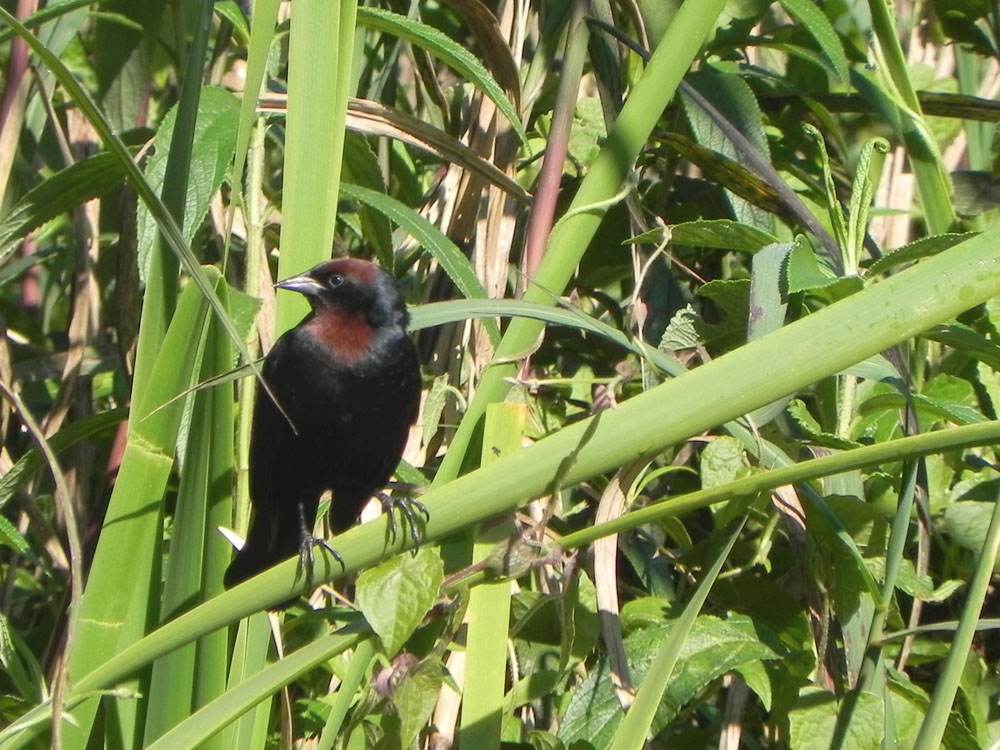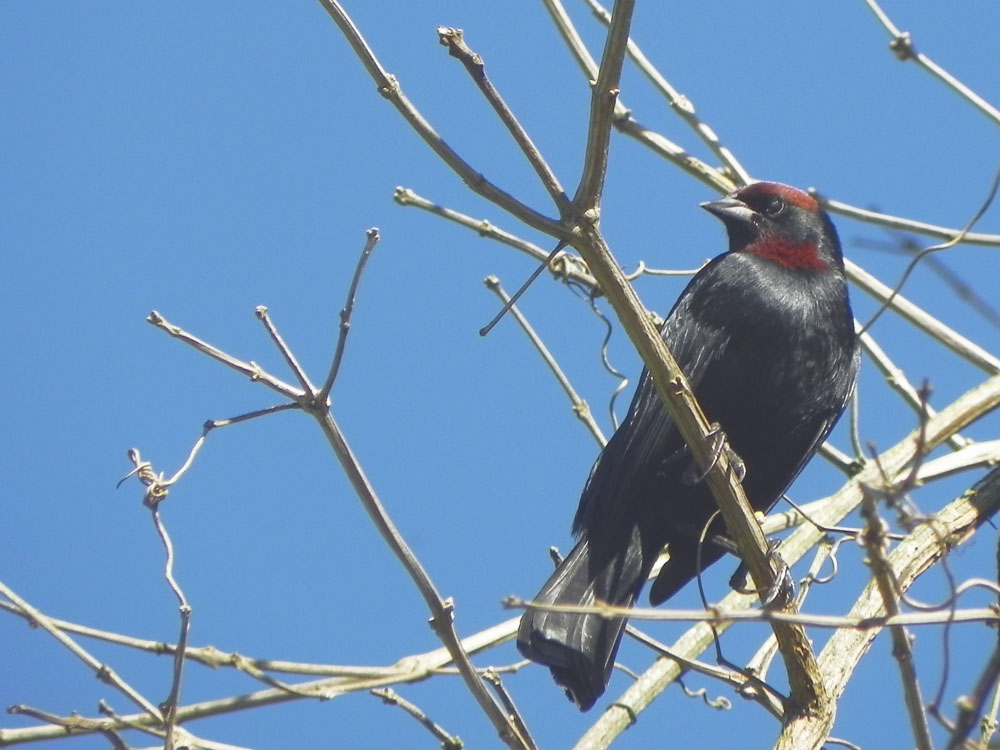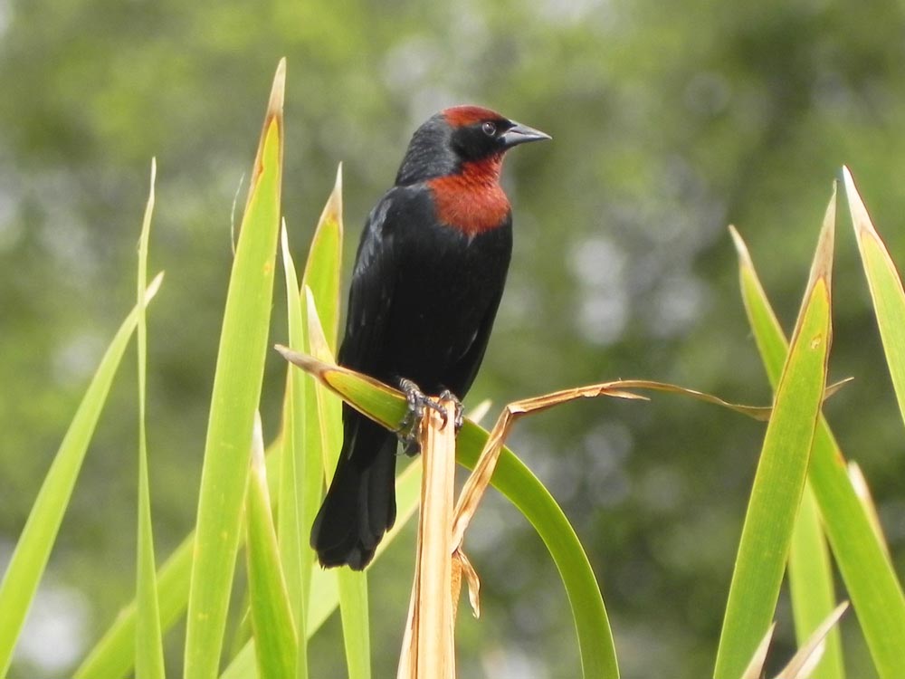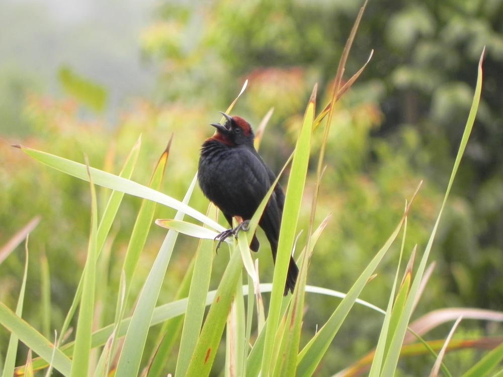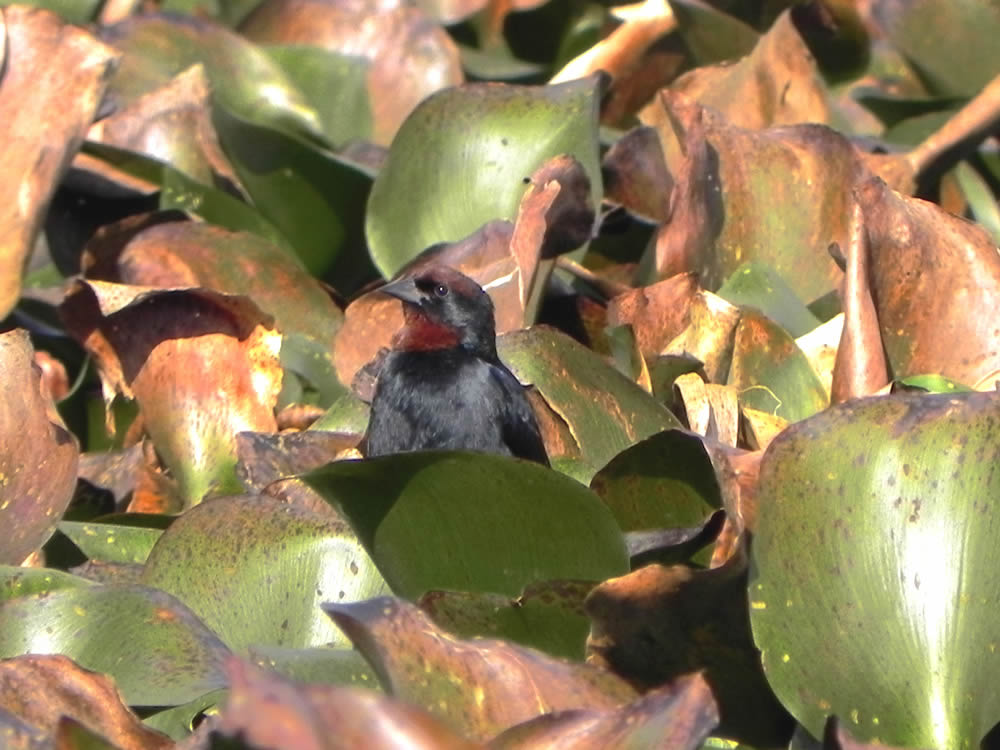 Cores: O macho apresenta plumagem negra, tendo a coroa, a garganta e o peito em vermelho fosco (pardo). Dependendo da iluminação e a distância, em que o pássaro se encontrar, as partes vermelhas não são visíveis e a ave parece totalmente negra. A fêmea apresenta plumagem pardo-olivácea, com barriga e lado superior estriados de negro e pardacento-claro; sendo difícil de ser identificada, salvo, quando está próxima ao macho.