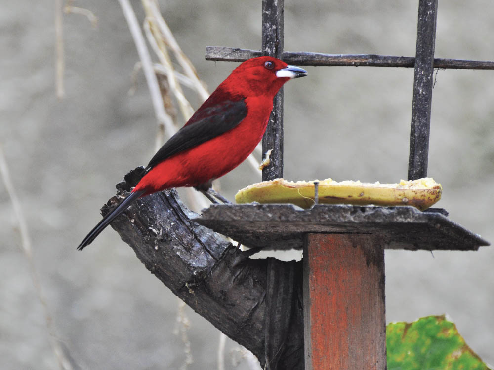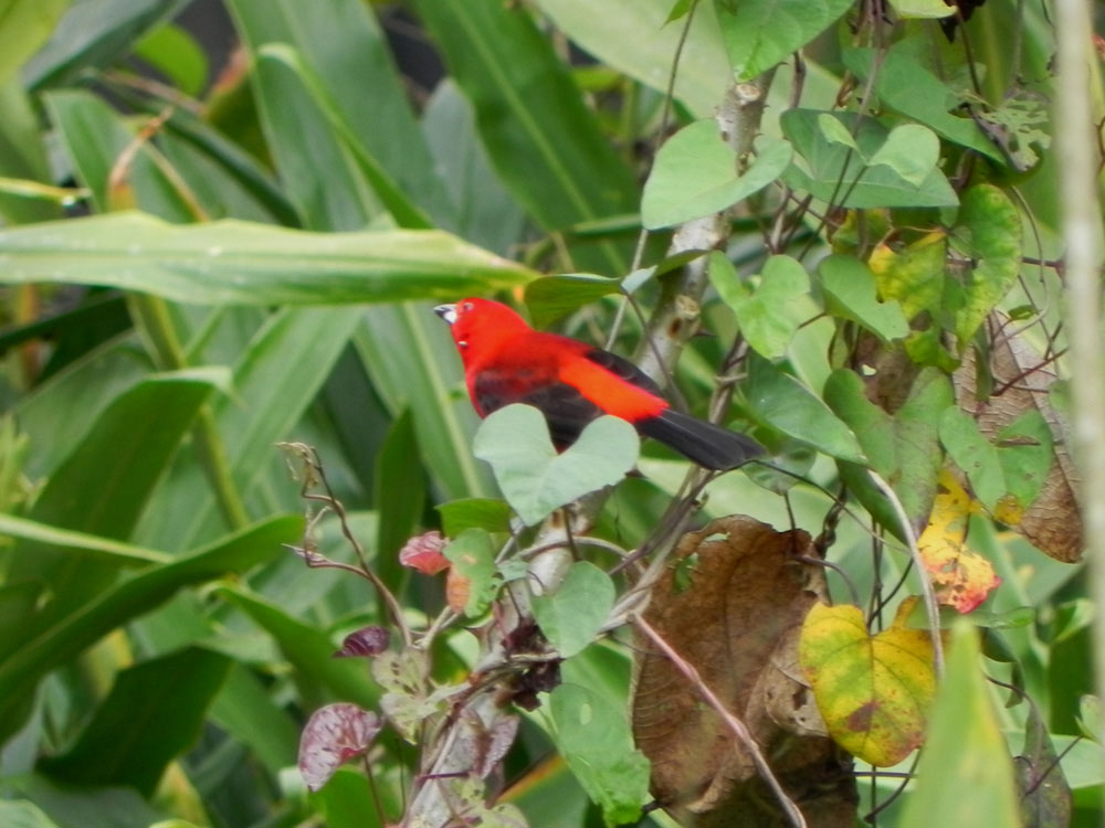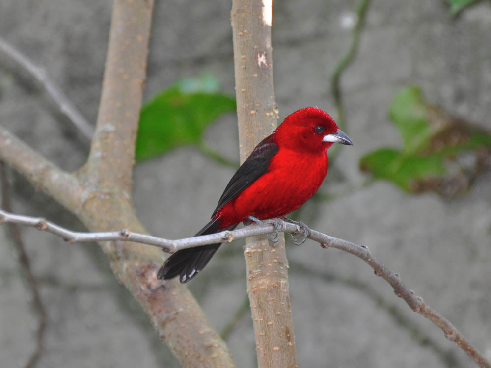 A plumagem do macho é de um vermelho-vivo, que lhe deu origem ao nome. Parte das asas e da cauda são pretas. A espécie apresenta dimorfismo sexual, sendo a plumagem da fêmea menos vistosa, de cor parda nas partes superiores e marrom-avermelhada nas inferiores. Pesa cerca de 31g e mede 19 cm de comprimento.
