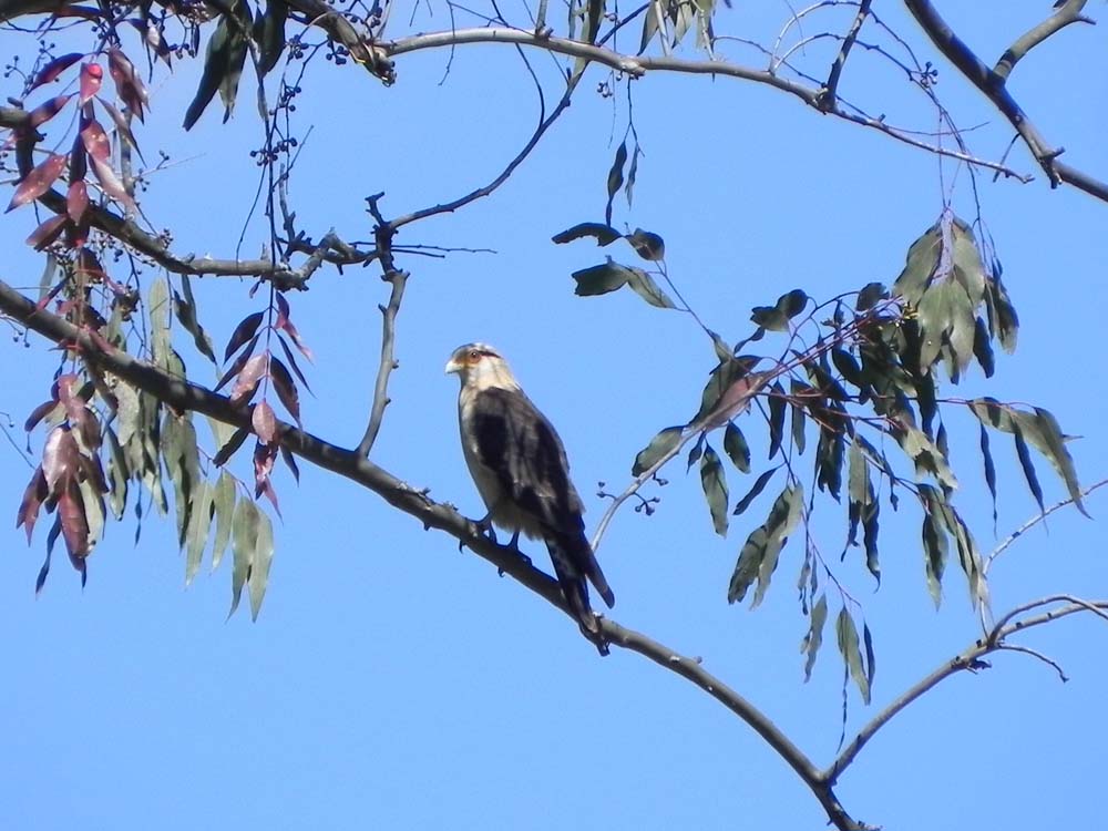 Possui cerca de 40 centímetros de altura e 74 centímetros de envergadura, cabeça e corpo branco-amarelado, dorso marrom-escuro, listra pós ocular preta, asas longas com mancha branca perceptível quando em vôo. A cauda é longa com larga listra marrom escura na ponta. Alimenta-se principalmente dos parasitas de bovinos e equinos tais como carrapatos e bernes. Quando não encontra carrapatos, seu prato principal, se alimenta de lagartas e cupins, saqueia ninhos, se alimenta de carniça, frutas e outras opções.