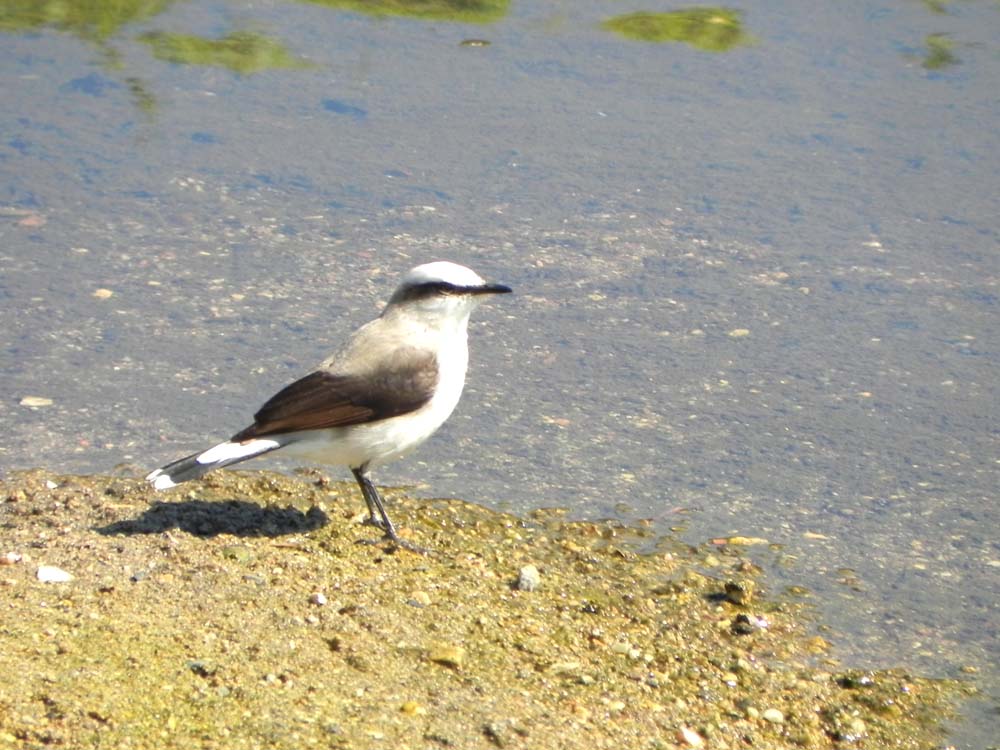 Sua coloração é principalmente branca contrastando com uma estreita faixa transocular preta que termina em uma leve curvatura para baixo logo após região auricular. A testa, coroa e nuca são brancas. O manto apresenta coloração clara levemente castanho-acinzentado. As asas apresentam coloração escura com tons castanho-acinzentado mais escuros que o manto. O uropígio e as penas supra-caudais são brancas. A cauda é preta e apresenta as porção distal com manchas brancas. A garganta, peito, ventre, crisso e infra-caudais são brancos.