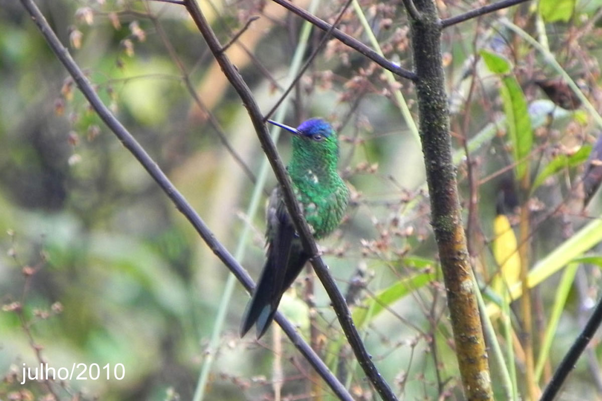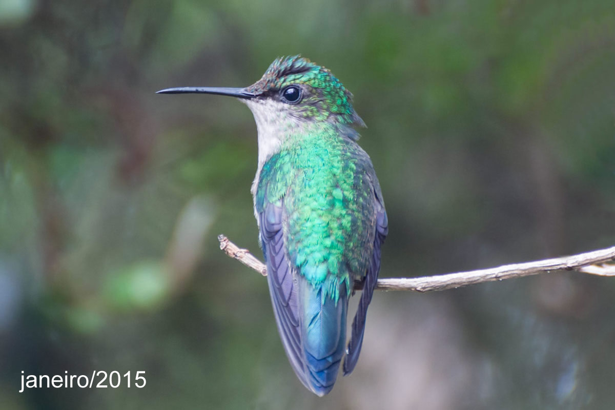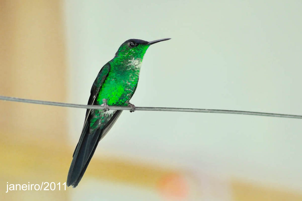 Mede aproximadamente 11,1cm. Verde brilhante de boné azul-violeta, tufos do crisso brancos, retrizes azul-aço, bico negro. A fêmea apresenta as partes inferiores brancas sujas, retrizes laterais com pontas brancas, testa e lado inferior às vezes lavados de canela.
