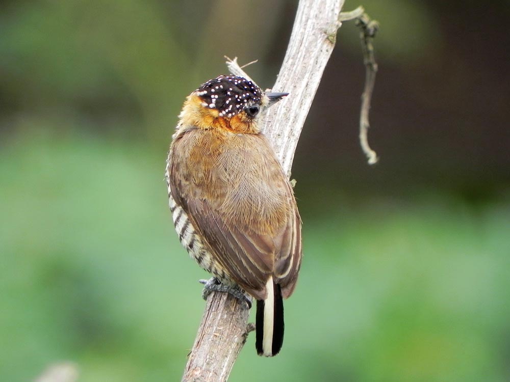Mede aproximadamente 9 centímetros. Apresenta uma região de coloração ocrácea na face e pescoço e tem a coloração geral castanha, especialmente nas partes superiores. O macho apresenta as manchas da testa vermelhas enquanto na fêmea estas são brancas. O macho imaturo, já próximo da maturidade, apresenta barras das partes inferiores quase definidas e a testa sem manchas brancas.