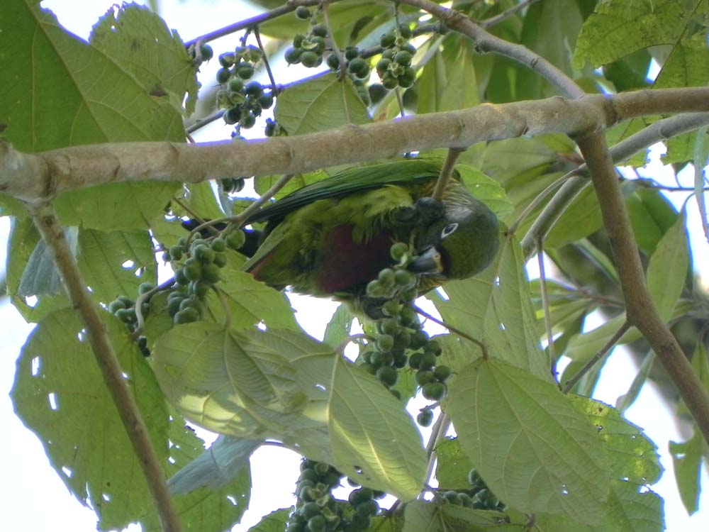 Mede cerca de 27 cm de comprimento. São verdes, inclusive as bochechas, com a zona auricular pardacenta. Fronte, abdômen e face inferior da cauda de cor vermelho. Região perioftálmica branca assim como a cara. Não possui diferenças externas aparentes entre machos e fêmeas.