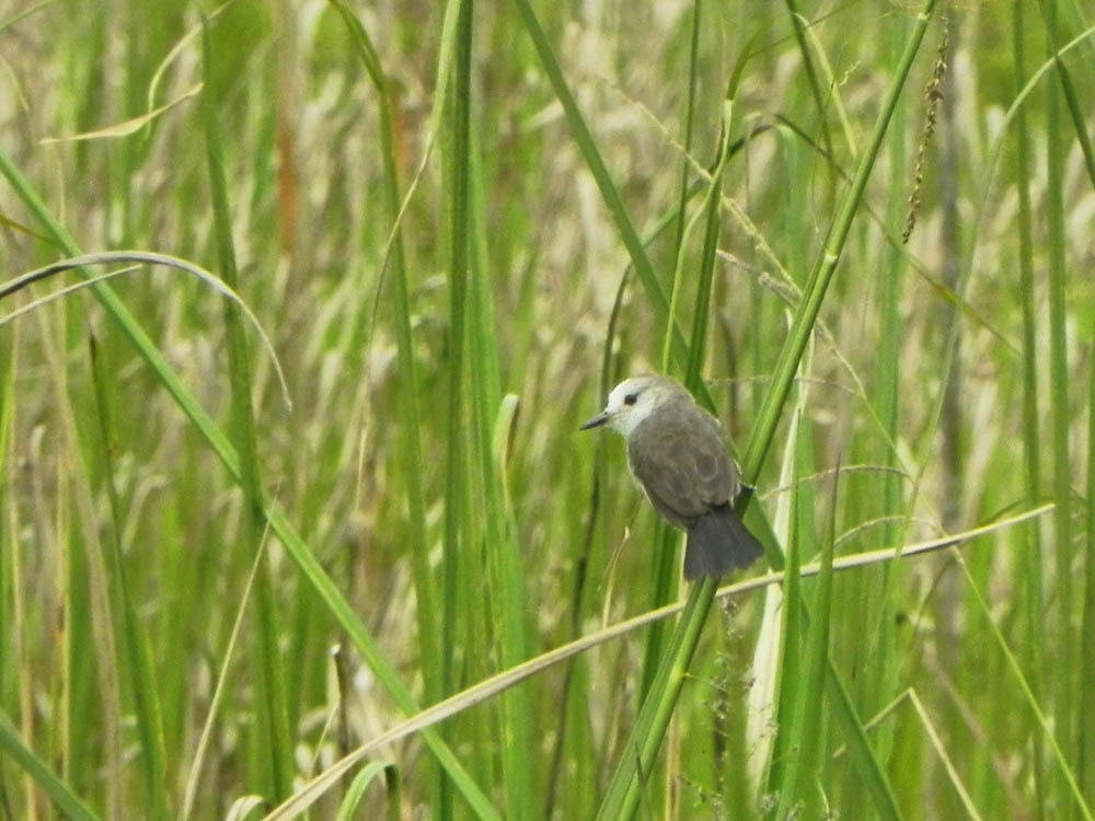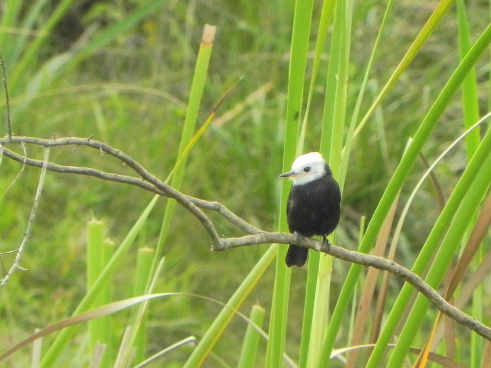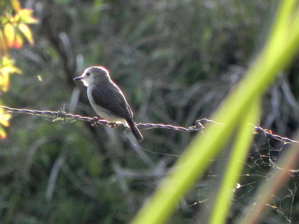 O macho é quase todo preto, com apenas a cabeça e a garganta brancas. A fêmea tem as partes superiores marrom-acinzentadas, as inferiores esbranquiçadas e apenas a testa branca. Os imaturos são acinzentados. A cauda, pequena, contrapõem-se à cabeça relativamente grande (ressaltada por manter as penas um pouco eriçadas). Apresenta um peso de 14g e um comprimento 14 centímetros. Primeiro registro em 2010-09-01