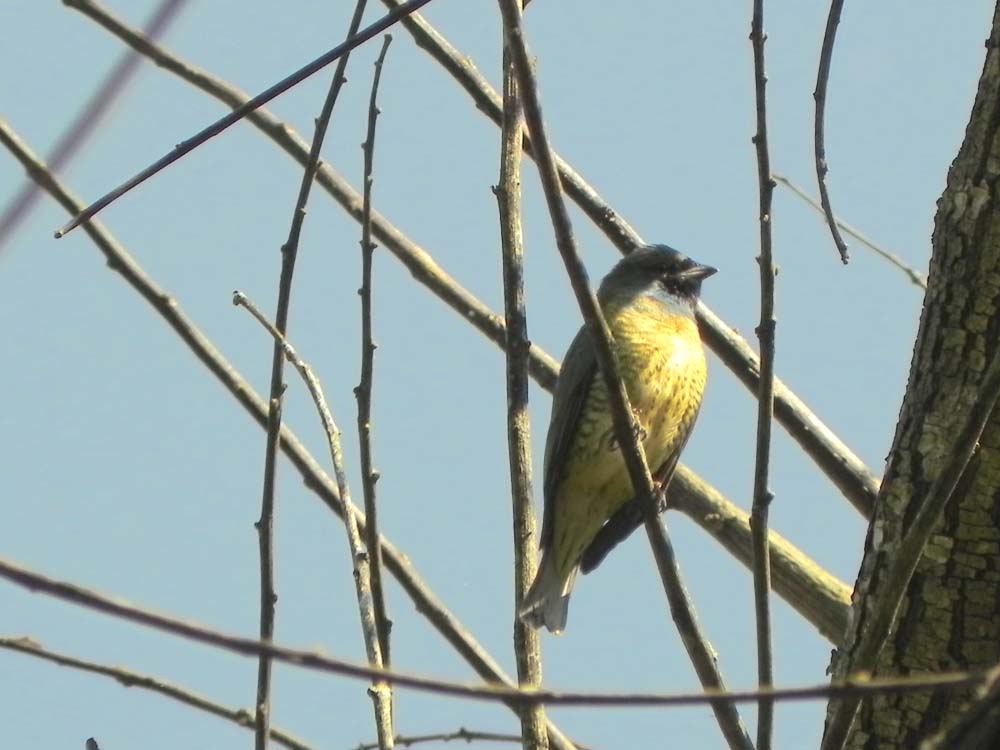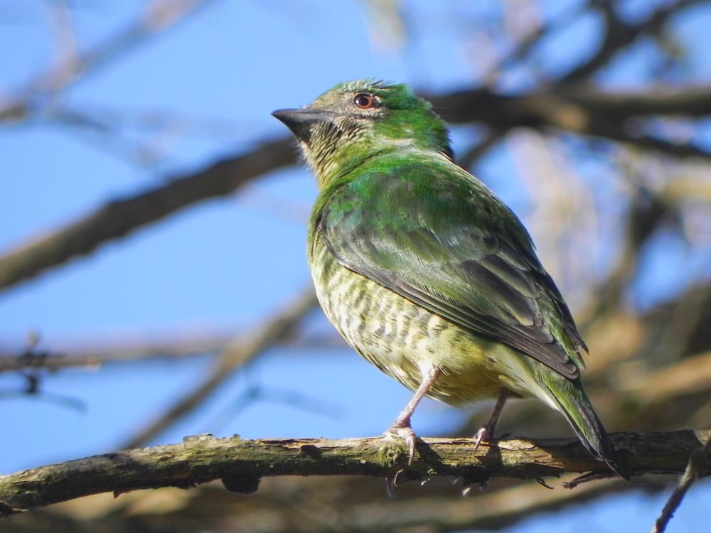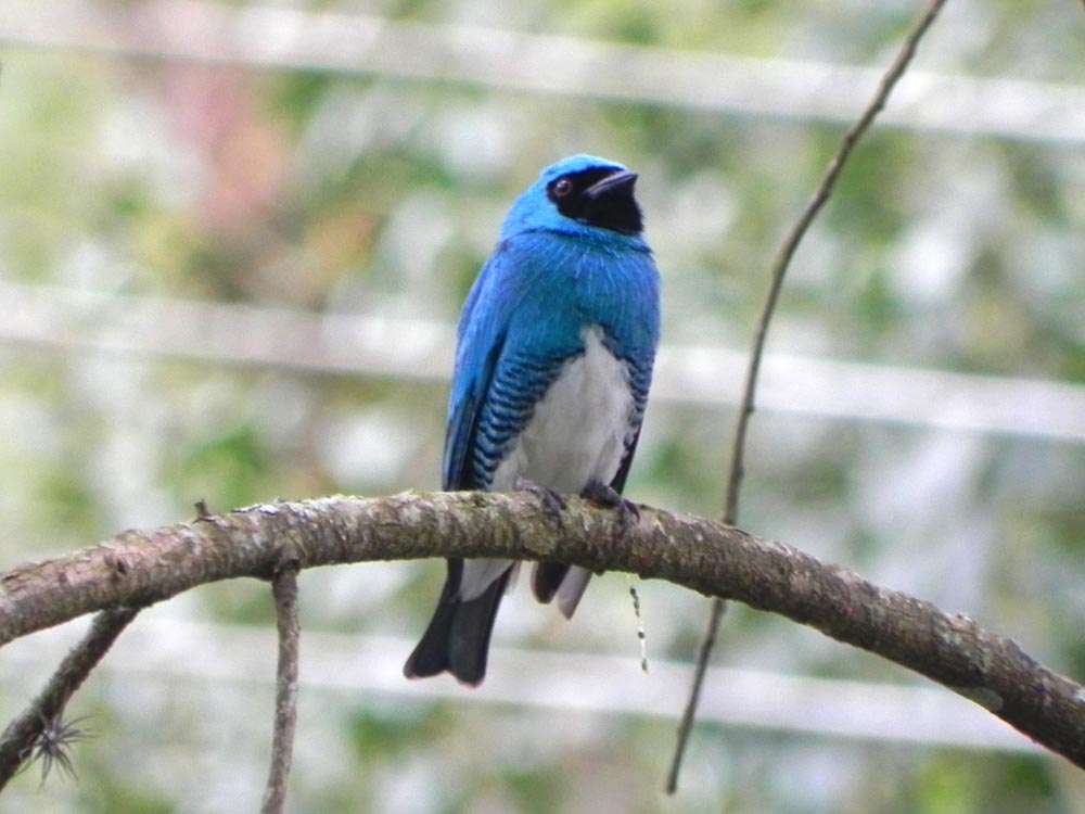 O macho desta espécie é azul-brilhante com a cara e a garganta negra. A fêmea e o macho juvenil são esverdeados, em tom brilhante nas costas e amarelado nas partes inferiores. Nos dois sexos, há uma série de riscas escuras na plumagem ventral, branca no centro da barriga do macho e amarelada na fêmea. Possui um forte chamado metálico de contato, sendo muitas vezes escutada antes da primeira visualização.
