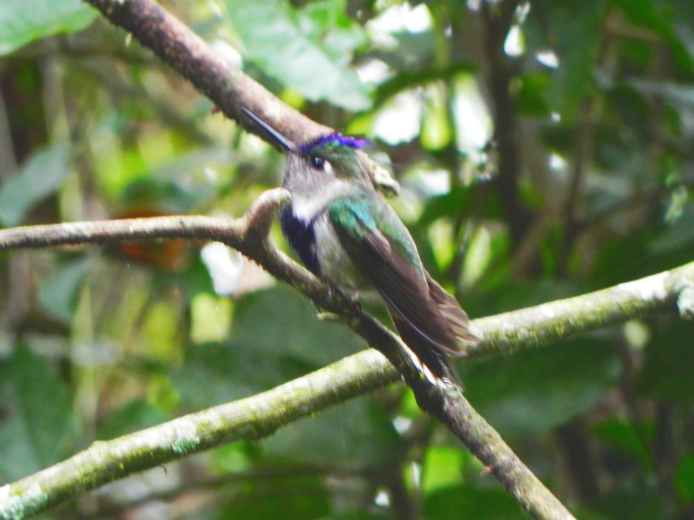 Mede cerca de 8,5 cm de comprimento. O macho adulto apresenta um topete verde com o penacho comprido mais escuro, ventre cinza claro com uma mancha grande azul. Aves do sul do Estado de São Paulo e para o sul apresentam topetes azuis. É verde no dorso com preto e branco nos cantos da cauda parda. Os machos jovens e as fêmeas são verdes no dorso e cinza claros no ventre, com uma pinta branca atrás dos olhos; o bico é curto e reto.