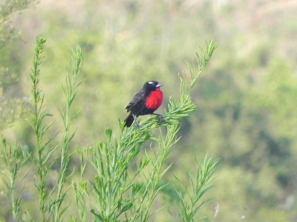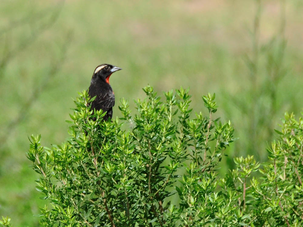 O dimorfismo sexual é evidente: no macho a gola e o peito são de um belo vermelho escuro, uma estria branca parte do olho e estende até o pescoço, no restante da plumagem predomina o negro. Na fêmea domina o marrom em várias tonalidades e o vermelho do peito é leve. O tamanho varia entre 17 e 18 cm.