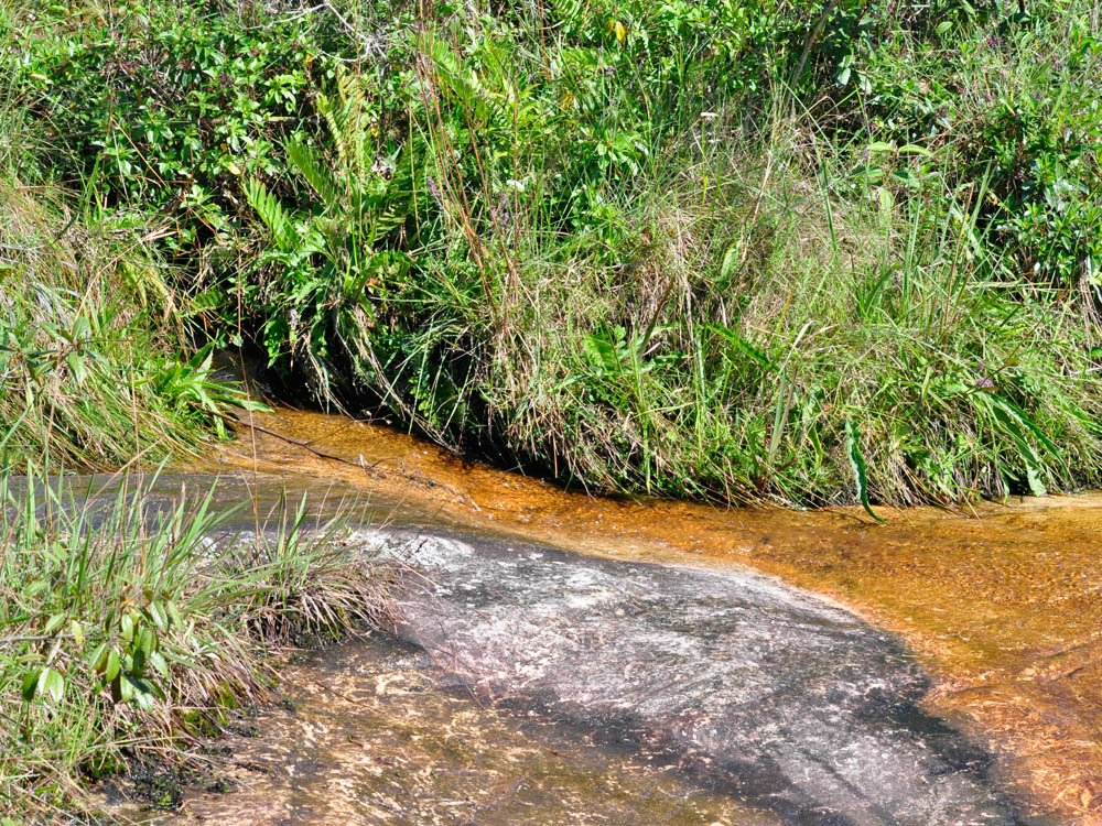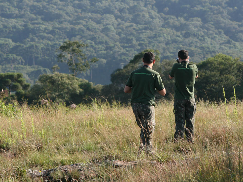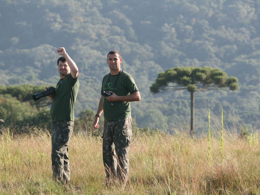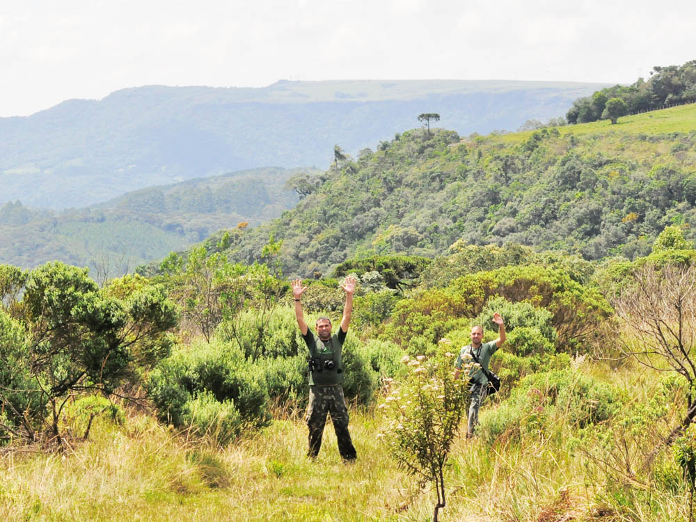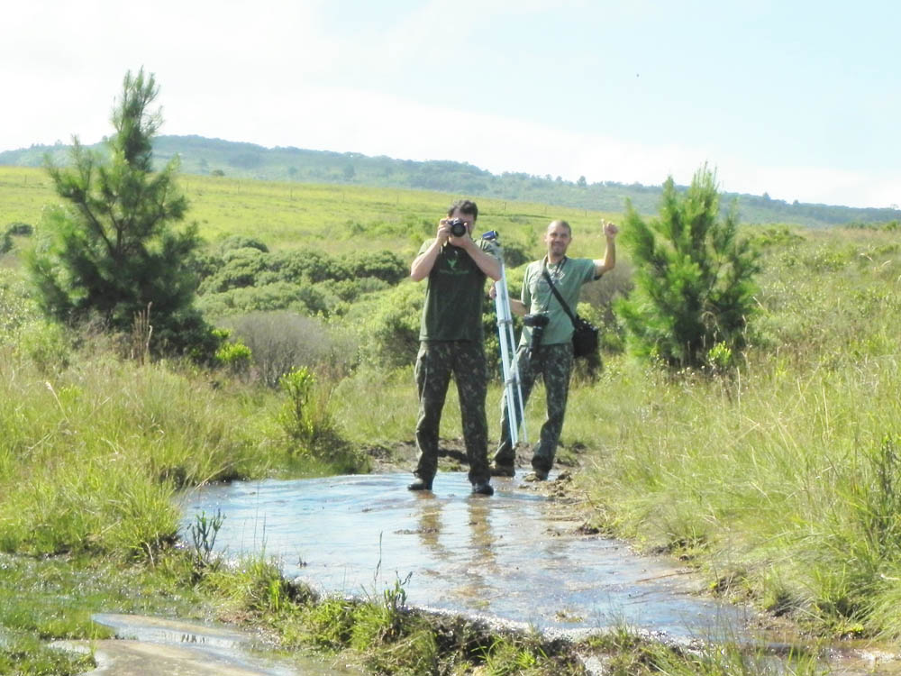 Combinamos que se continuássemos tão encantados com o que víamos em cada ponto, parando a todo momento, não iríamos chegar ao nosso destino. Decidimos então nos encaminhar à parada final: A pousada Cainã. Local que só pela beleza e pela paz que transmite, já valeria a pena. Deixamos o carro nesse local e guiados pelo Reni, começamos a expedição a pé. Iniciamos a caminhada no campo próximo que descia em direção a um descampado. Imaginem o misto de emoção e ansiedade em querer encontrar as aves que nosso guia mencionou, como o Papa-Moscas e o Caboclinho. Onde essas aves estariam escondidas aguardando nossa chegada? Com esses pensamentos, iamos nos aproximando, mas como a melhor parte de uma passarinhada é sempre a surpresa que ela nos trás, ao olharmos para o céu, que de tão azul, parecia um quadro de Portinari, vimos a majestosa ave voando baixo em nossa direção. Seu vôo altaneiro prendeu nossa atenção por minutos. Seus desenhos sob as asas chamaram a atenção. Um Gavião-de-rabo-branco ainda jovem mostrou que essa espécie está preservada e consegue se perpetuar. A surpresa inicial sequer havia passado quando novamente do alto desceu outro falconídeo, uma Águia-Chilena, esta já adulta. Incrível pensar que duas espécies estão dividindo o espaço sem que haja conflitos. Só até aqui, a passarinhada já valeu a pena e o que viesse após isso, seria o maior lucro. Continuamos pelos campos alagados e muitos Pintassilgos se alimentavam nos arbustos. O Reni nos conduziu a uma área onde em outras oportunidades ele havia encontrado as aves que queríamos registrar. Nesse local, os campos possuem uma característica marcante: o terreno alagado! Vimos o quanto esse tipo de terreno possui o bem mais precioso da terra que é a água. Ela encharca o solo de tal maneira que nas regiões mais baixas formam córregos lindos e de água cristalina que descem através dos precipícios em forma de cachoeiras.