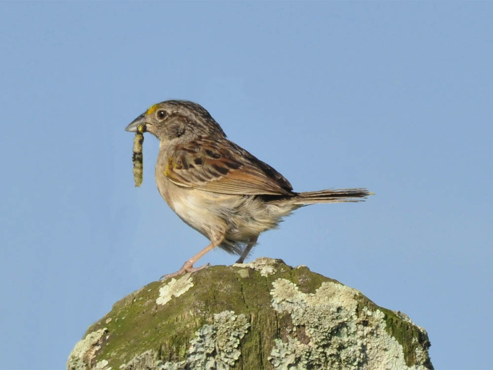 Íamos rodando e ao encontrarmos alguma espécie ou cena que nos chamava a atenção, parávamos para registrá-los. A cada metro que percorríamos, os pássaros faziam com quem parássemos. Assim foi com o Cochicho, que pousou em um arbusto à beira da estrada e posou para nossas lentes e com um vulto preto e branco que foi pousar nos mourões. Tratava-se da Primavera, inconfundível com seus olhos vermelhos. Arredia, somente permitiu que nos aproximássemos de dentro do carro, e de lá, conseguimos um ótimo registro. Vale ressaltar que vários outros indivíduos passaram em nosso caminho, mas não permitiram uma aproximação. O sol da manhã já se fazia forte e as aves aproveitavam para secar suas penas pousadas nos fios de eletricidade, como as andorinhas, que aos bandos revoavam as plantações de milho e soja. Ficamos todos encantados com as propriedades que de tão bem cuidadas e de uma beleza arquitetônica ímpar, nos fizeram lembrar as fazendas do interior da Europa. Numa delas, bandos de Curicacas, onde contamos cerca de 20 indivíduos, se reuníam nos gramados para procurar alimento. Nosso êxtase nesse ponto já era total quando em um ponto logo adiante, flagramos uma cena de grande fotogenia: Um Tico-tico-do-campo saíndo da plantação de soja com seu café-da-manhã no bico, pousou próximo de nós e permitiu que fizéssemos um registro como nunca imaginamos fazer dessa ave.