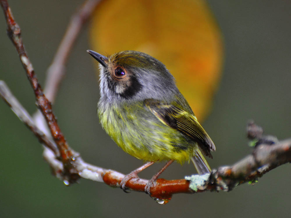 É um dos menores papa-moscas, tem apenas 7 centímetros. Sua cauda é curta, a barriga é amarela, garganta branca rajada de preto, píleo verde-pardacento, e na cabeça atrás da região auricular esbranquiçada localiza-se uma grande mancha negra.