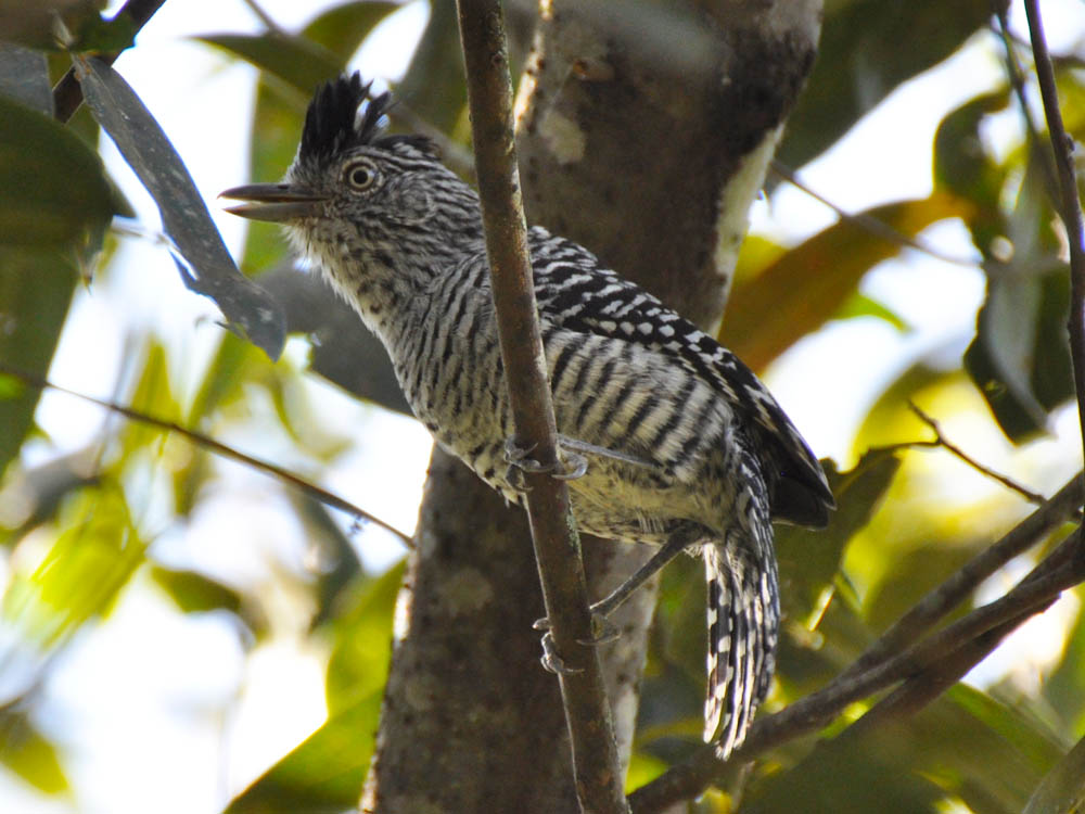 Domina no macho a coloração negra, enquanto na fêmea ela é amarronzada. Entretanto, o macho é todo barrado (razão de um dos nomes comuns), exceto pelo negro uniforme do alto da cabeça, enquanto a fêmea possui somente os lados da cabeça estriados. Na ave adulta, o olho é branco com leve tom amarelado (marrom avermelhado nos juvenis). Também mantém as penas da cabeça eriçadas boa parte do tempo, em um topete muito destacado. Apresenta um comprimento de 16 centímetros.