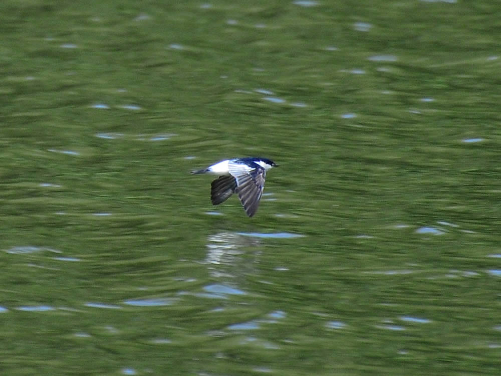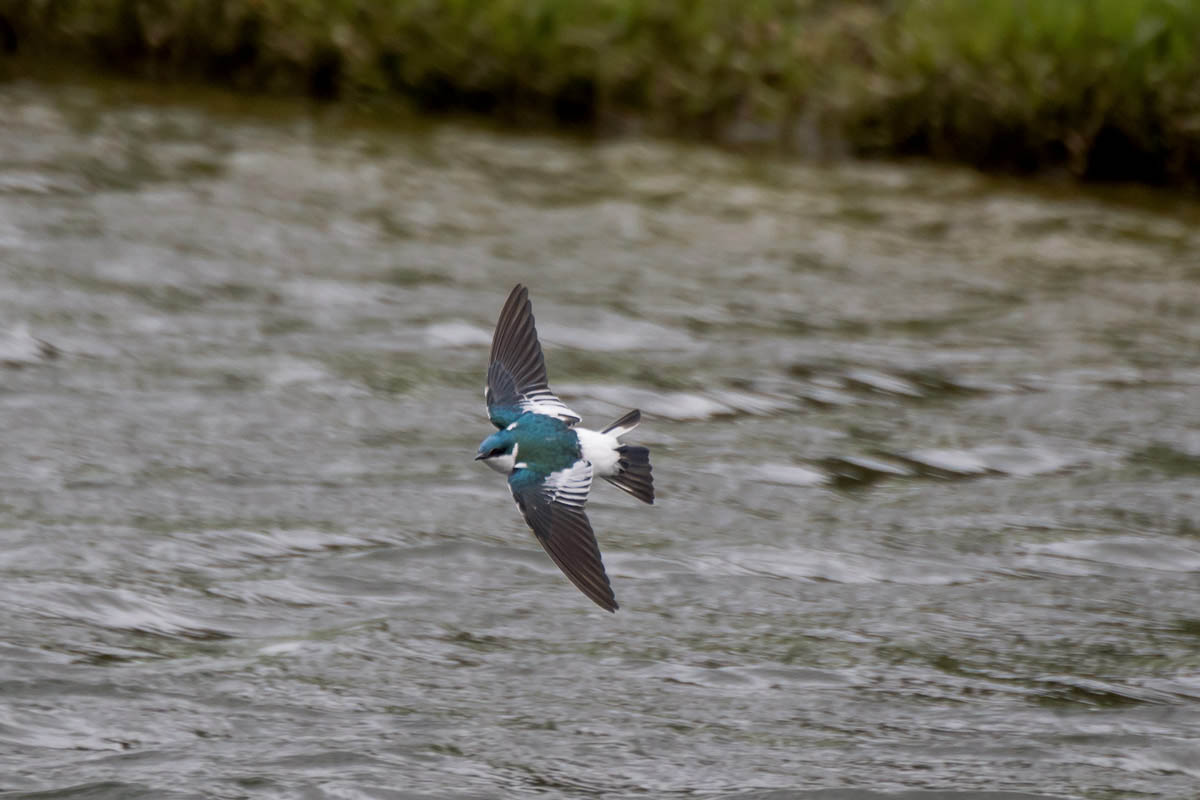 Como enfatiza o nome comum, muito ligada à água. A semelhança com a outra espécie do gênero torna a identificação difícil, em muitos casos. As melhores características para determinação segura são o tom esverdeado dominante na plumagem das costas, mais notável sob luz intensa e a área branca sobre a asa (embora os juvenis da andorinha-de-sobre-branco (Tachycineta leucorrhoa), também tenham um pouco de branco no mesmo local). Mede cerca de 13,5 cm.
