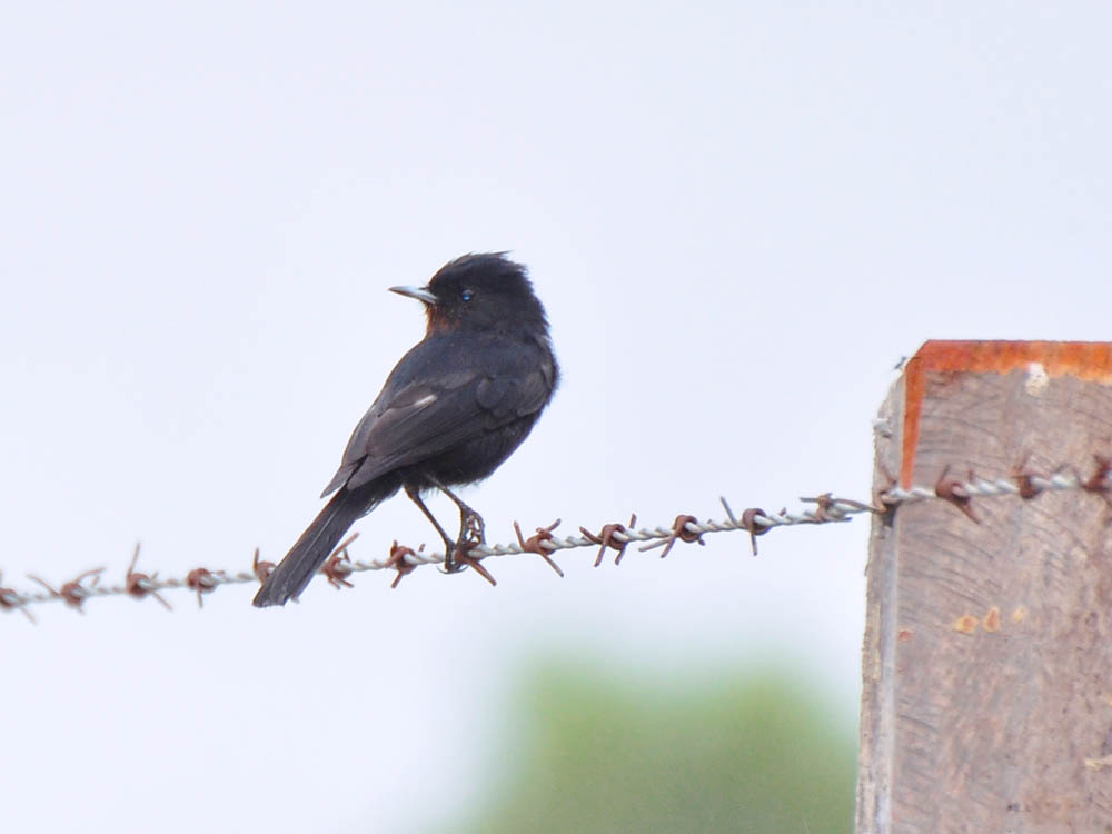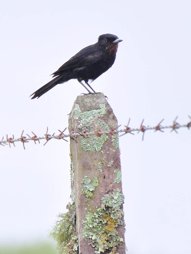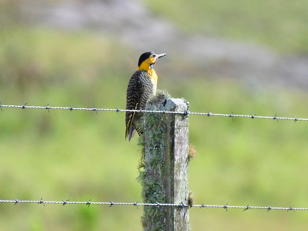 Ao longo do caminho, pudemos registrar novamente o Canário-do-campo, que havíamos fotografado na visita anterior e em uma dessas paradas, percebemos uma ave negra procurando seu alimento no chão e rapidamente voando para os mourões da cerca próxima. Era uma fêmea de Maria-preta-de-garganta-vermelha, que há tempos queríamos registrar. Logo adiante, em uma das muitas fazendas que se espalham ao longo, um bando de Graúnas pousou em um plátano próximo, fazendo um pontilhado negro e barulhento e assim conseguimos boas fotos.