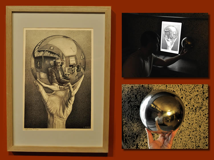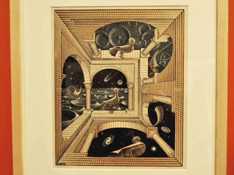 Os pássaros também fazem parte das obras surreais de Escher como em “outro mundo”, “enladrilhamento I”, “enladrilhamento II”. Em quadros de maior tamanho, admiramos outra faceta do artista ao trabalhar com obras holográficas.