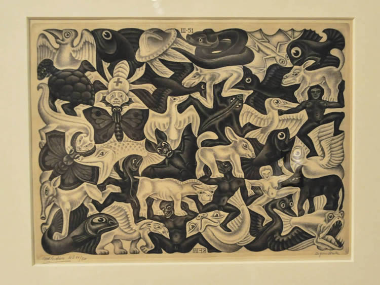 O mês de maio não trouxe apenas o frio de volta a Curitiba. Trouxe uma riqueza... algo que emociona os olhos e o coração dos curitibanos e de todos os que aqui visitam. Está em exposição no Museo Oscar Niemeyer uma retrospectiva da obra de Maurits Cornelis Escher, o expoente da pop art e da opart, chamado de o artista do impossível. São dezenas de xilogravuras e litogravuras, muitas delas inspiradas em temas contendo aves. É possível admirar o talento do artista em reunir em uma única obra pássaros e peixes como em “céu e água”, “predestinação” e “pássaros e peixes”. Ou em outras obras, em que o tema é a geometria e as aves, como em “cisnes” ou mesmo na dualidade do claro e escuro, refletida nas obras “dia e noite” e “dois pássaros”. O artista além do claro-escuro, também utilizou as cores, nas técnicas de enladrilhamento para relacionar as formas geométricas que se convertem em pássaros.