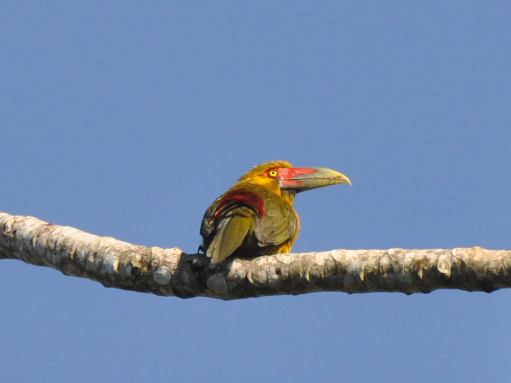 Após uma breve viagem, iniciamos a jornada por uma estrada de terra, com elevações; algumas com mais de 30o. Em cada trecho, as aves começavam a acordar para tomar os primeiros raios de sol da manhã. Em um trecho da estrada rodeado por embaúbas, avistamos nossa primeira ave: um casal de Araçaris-banana, que se fartavam nos frutos maduros da árvore. Esta espécie também foi avisatada praticamente em todo o percurso.