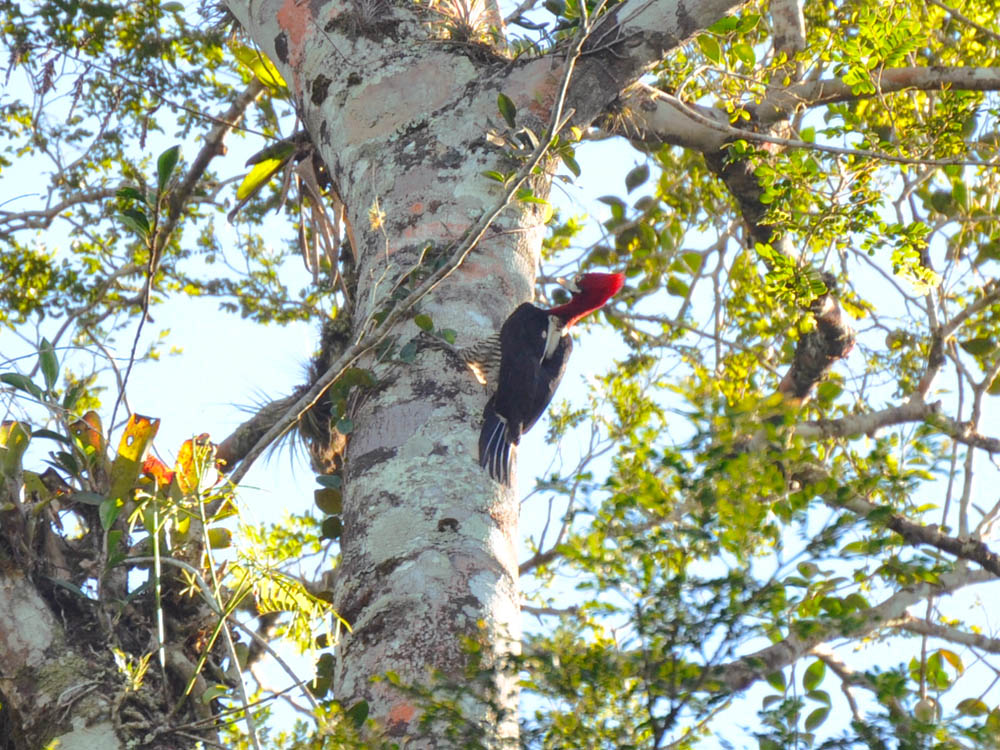 Pendentes aos fios de energia que margeavam a estrada, muitas Viuvinhas davam voos rasantes para apanhar insetos. O sol ja começava a esquentar mais e tocava as copas das árvores centenárias. Em uma dessas, avistamos um casal de pica-paus-rei que bicavam o tronco à procura de sua refeição matinal. Seguindo por alguns quilômetros e indo mais a fundo na floresta, encontramos um lago represado e muitas andorinhas que voavam junto à água, capturando os insetos que se alojavam por entre os aguapés.