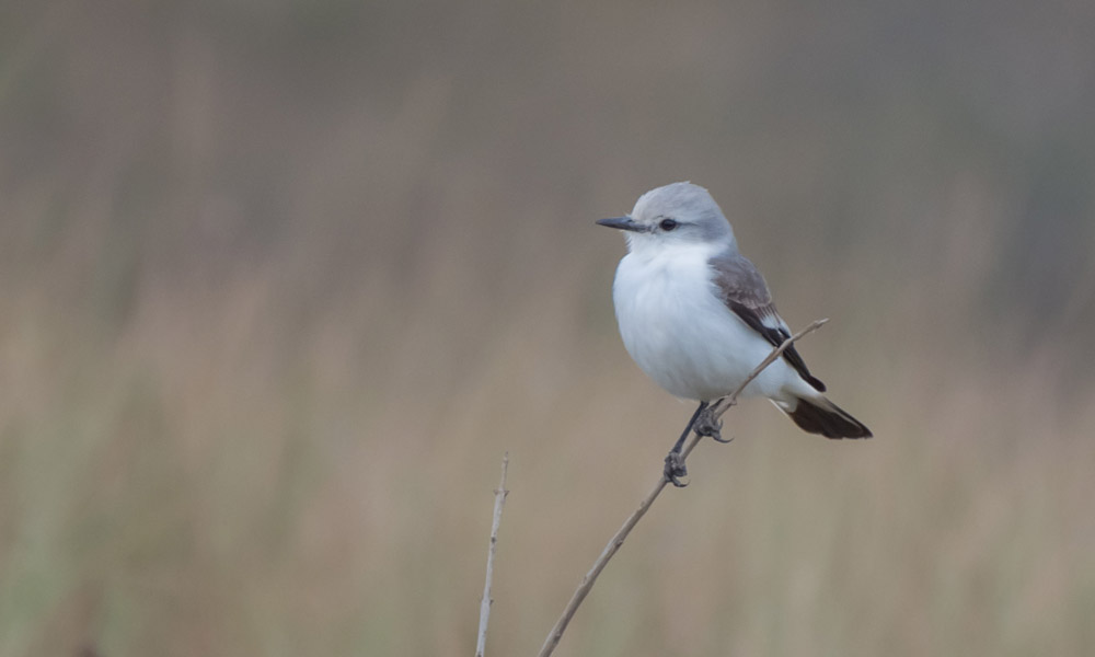 Mede cerca de 20 centímetros. Cabeça esbranquiçada, uropígio e coberteiras superiores da cauda brancas, também a base da cauda. Pode ser confundinda com duas outras espécies do gênero, a noivinha (Xolmis irupero), que possui o corpo quase inteiro branco, exceto pelas asas e cauda, e a Primavera (Xolmis cinereus), que é mais cinzenta, tendo a noivinha-branca, portanto, uma coloração intermediária entre estas duas espécies.