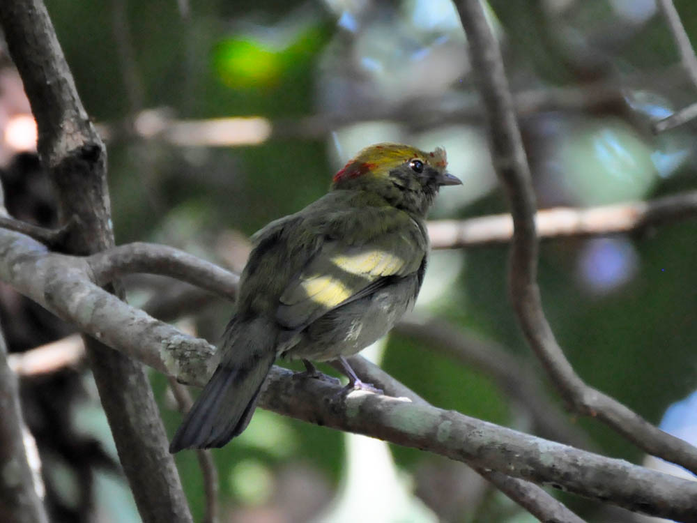 Mede cerca de 14,5cm. Como na maioria das espécies da família, o macho se destaca da fêmea. Possui uma vasta crista vermelho vivo que vai do alto da cabeça até o meio das costas, com penas negras no restante do corpo. Sobre o bico, um tufo de penas mais compridas e dirigidas para a frente tem um formato marcante, originando o nome mais comum desta ave. A fêmea e o macho recém saído do ninho tem a plumagem de cor verde uniforme. O jovem macho leva três anos para adquirir a plumagem característica. Nesse período, podem ser observados machos com partes da plumagem colorida e o restante esverdeada.