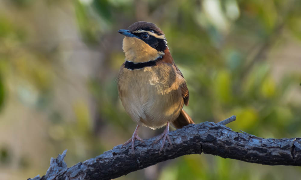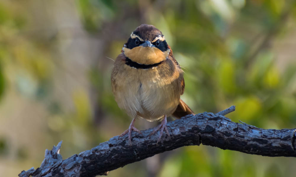 Possui cerca de 14 cm de comprimento e 15,8 g de peso. Pode ser facilmente identificado pelo seu colar negro que atravessa a região da garganta e pela sobrancelha branca logo acima de uma larga faixa negra sobre os olhos que se estende da base do bico até a nuca, a parte inferior é branco-amarelada e a costas ferrugíneas. Possui ainda uma mancha ferrugínea mais avermelhada na nuca que se estende até o colar negro nos lados do pescoço. É uma ave de difícil visualização por permanecer a maior parte do tempo muito próxima do solo.