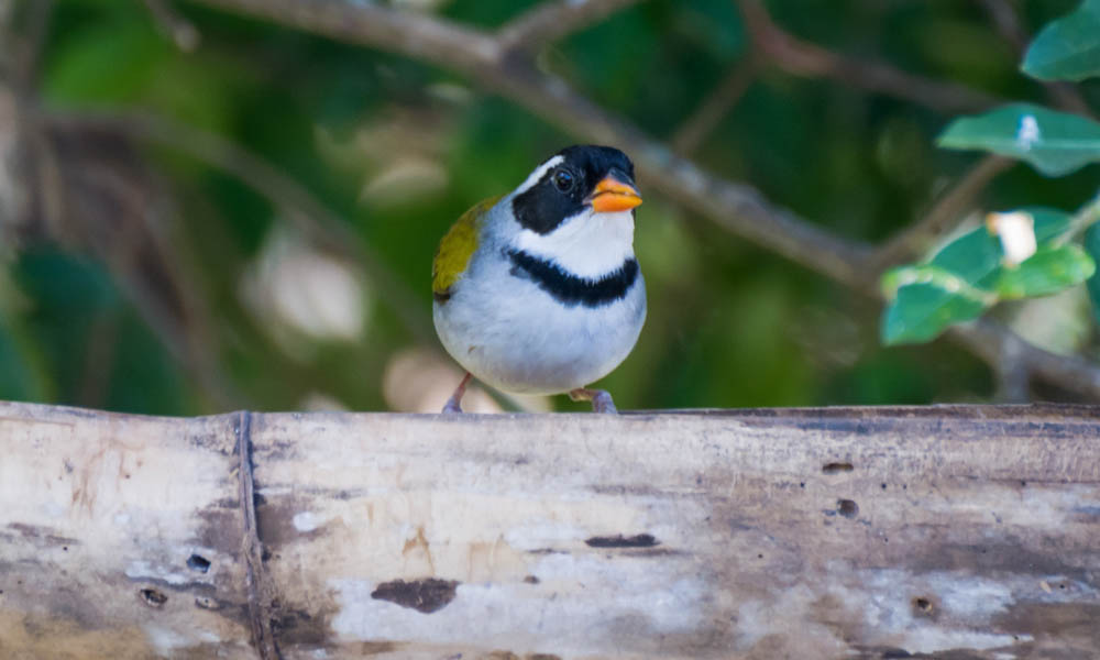 Suas cores destacam-no contra o fundo sombreado do chão da mata, enquanto pula entre raízes ou nos caules verticais das arvoretas. O laranja forte do bico (faixa negra no cume) forma um contraste único com o negro da cabeça (listra acinzentada no centro) e a listra branca. Costas cinzas, com asas esverdeadas e o encontro amarelo. A garganta é branca, tendo uma característica faixa peitoral negra, larga. Dependendo da posição da ave, essa faixa pode parecer mais estreita do que é. O restante do peito e barriga cinza claro, quase branco. Longas pernas cinza e, se a luz estiver muito boa, é possível ver as compridas unhas brancas. O macho com a cabeça e o peito coloridos berrantemente de preto e branco, dorso verde, como cinzento. Bico amarelo-avermelhado. A fêmea é semelhante ao macho diferindo pelas partes inferiores ligeiramente pardacentas e pelo colar negro interrompido.