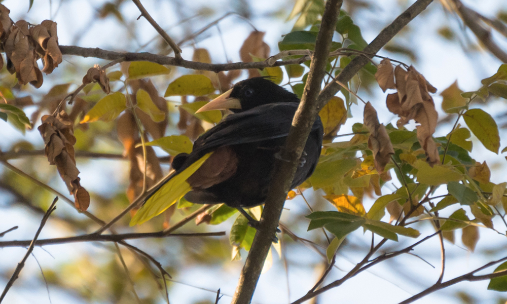 O macho mede de 46 a 48 cm de comprimento e a fêmea de 36 a 38 cm, pesam de 155 a 360 g. Faz ninhos grandes e compridos em forma de bolsa, localizados em colônias, em árvores isoladas na borda de florestas ou clareiras. Cada colônia tem um macho dominante, cercado por subordinados que o ajudam a defender o território.