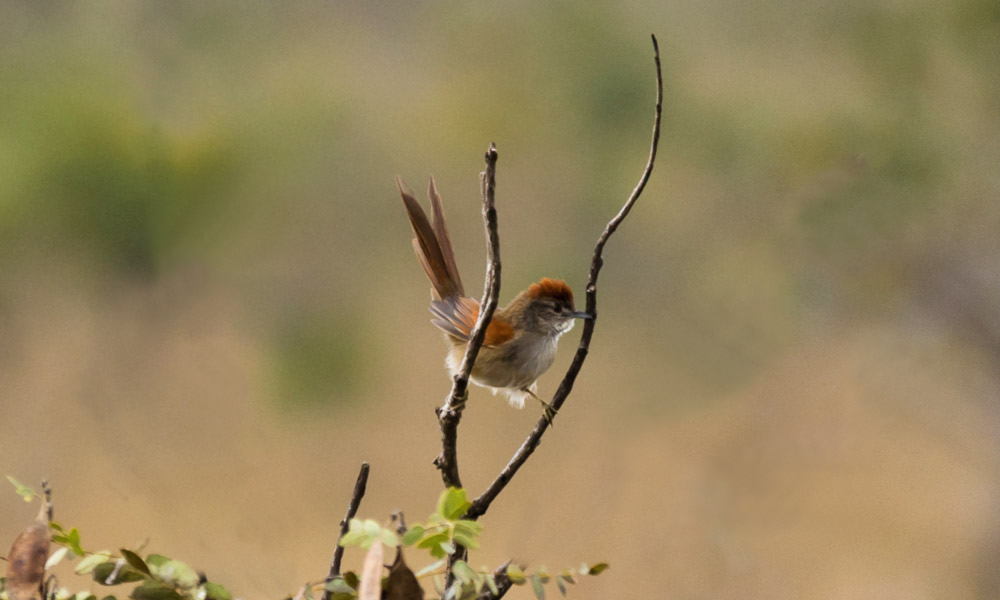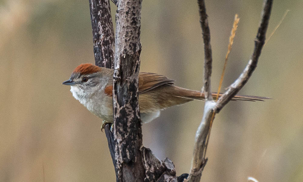 Medidas: Comprimento total 170 mm, asa 56 mm, cauda 93 mm, tarso 20 mm, bico 12 mm, peso 14g. É uma ave de tons gerais castanho acinzentado, com os encontros marrons-avermelhados, uma coroa cinza na testa, alto da cabeça também marrom-avermelhado. Possui a cauda marrom e também uma mancha preta na base da garganta. Sick menciona que, ao cantar, ele infla sua garganta revelando o preto das penas da base. Vive nos campos, cerrados, pastos, campos cerrados, capoeiras secas e campinaranas. Emite o canto, o dissilábico “uí-pi”, insistentemente enquanto saltita apressadamente por entre a vegetação arbustiva.