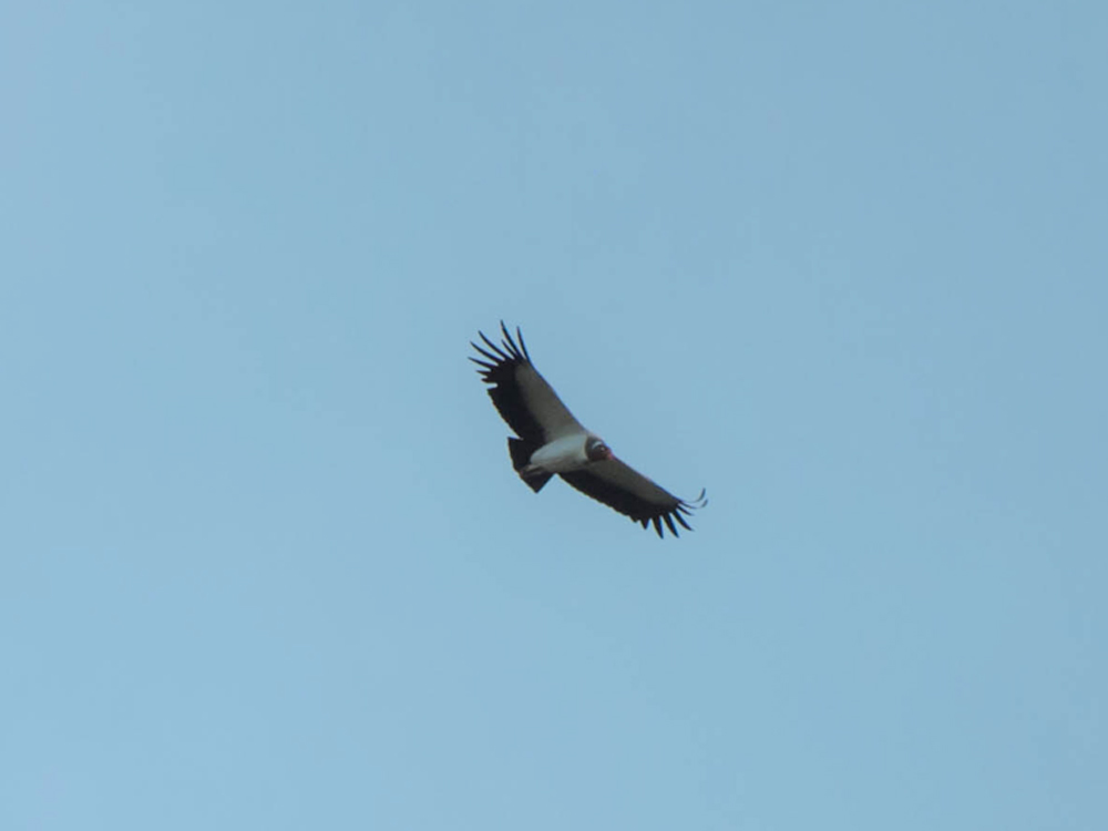 Possui uma envergadura que varia de 170 a 198 cm e peso que oscila de 3 a 5 kg, medindo cerca de 85 cm de comprimento. Tem cabeça e pescoço nus, pintados de vermelho, amarelo e alaranjado, a parte superior do corpo amarelo-clara, esbranquiçada, asas e cauda pretas, o lado inferior branco, com plumagem branca e negra. Sua dieta é estritamente carnívora, mas nunca se alimenta de animais vivos, salvo se estiver faminto e a presa estiver agonizando. Como consumidores de carne em putrefação desempenham importante papel saneador, eliminando matérias orgânicas em decomposição.