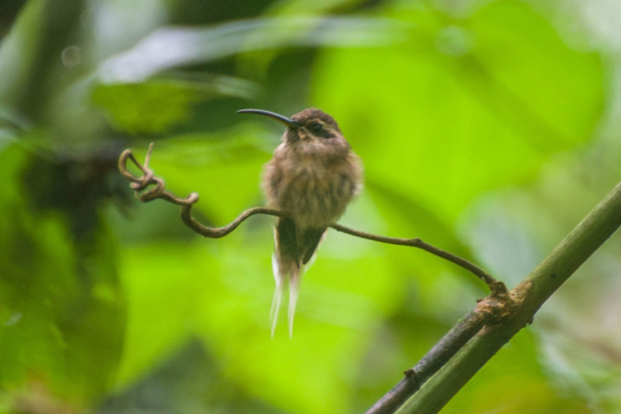 Mede 12 centímetros. Espécie relativamente pequena. Partes superiores marrom-esverdeadas; faixa superciliar e infraocular pardacentas delimitando uma área malar escura; garganta ferrugínea estriadas de preto; partes inferiores ferrugíneas manchadas de cinza-escuro; asas pretas; retrizes pretas com as pontas brancas, sendo as retrizes centrais prolongadas. Bico preto, com a base da mandíbula amarela.