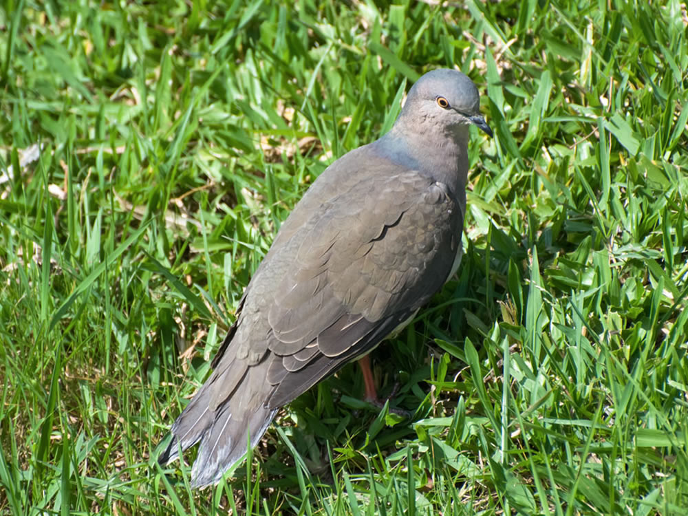 Tem 29 centímetros e pesa entre 160 e 215 gramas. Sua plumagem é marrom, com peito claro, cabeça cinzenta com alguns reflexos metálicos na nuca e alto dorso. Possui ainda, uma coloração azulada ao redor dos olhos.