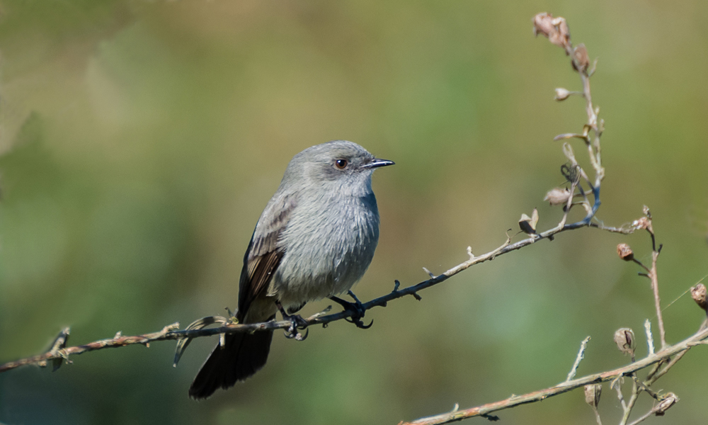 Mede até 12 cm de comprimento, com plumagem cinza-escura com a garganta mais clara, asas e cauda negras. Vive em beira de lagoas, rios e açudes. Alimenta-se de insetos capturados em voo a partir de árvores ou pedras nas margens de rios..