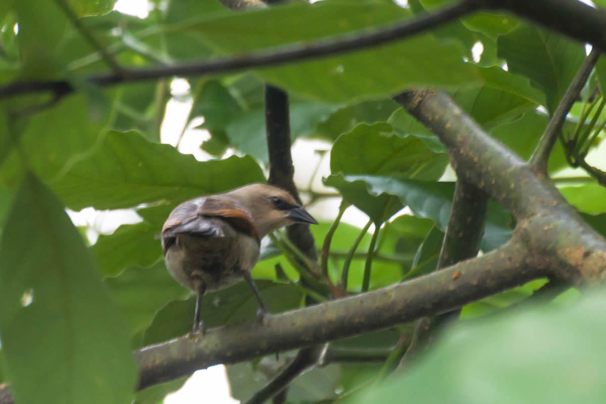 Mede de 15 a 17 cm. Não possui dimorfismo sexual. Tem cor geral marrom escuro, sendo as asas e a cauda mais escuras e as orlas das penas coberteiras marron-avermelhado. Possui uma espécie de “mascara” negra ao redor dos olhos. Tarsos negros. Bico cônico.